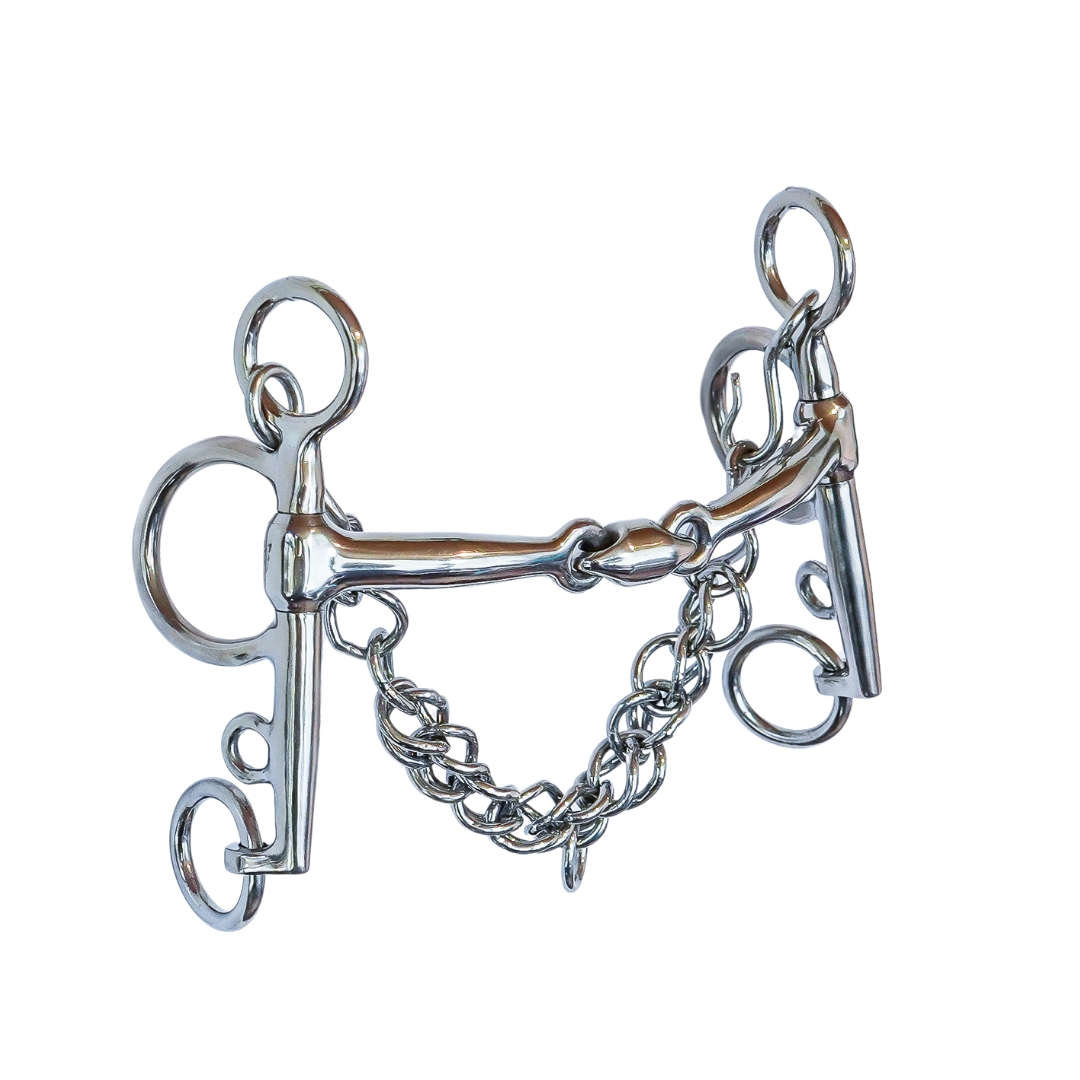 Very much like the Hanging Cheek, relieving tongue pressure but with the addition of a shank to apply other areas of control at the poll and curb. Designed to be used with a snaffle rein and a curb rein to allow for varying degrees of curb and poll pressure simultaneously whilst alleviating tongue pressure.